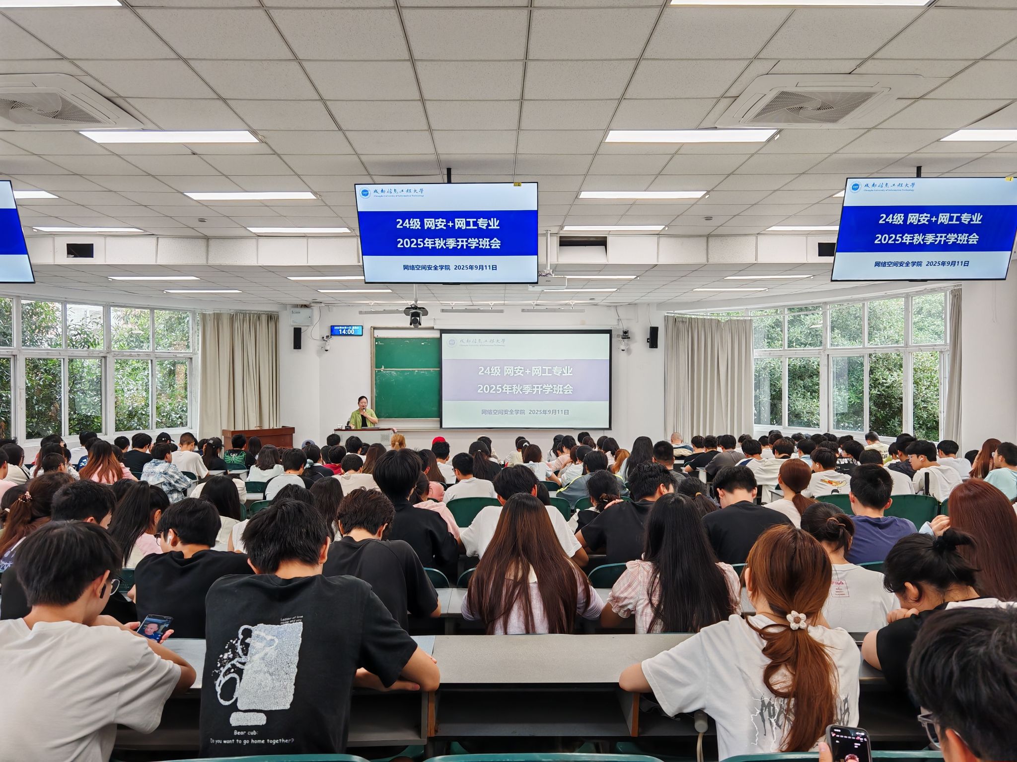 会议伊始,全体同学共同收看了“2025年四川省大中小学思政教育秋季开学第一课”。随后,韩阳对上学期的整体情况进行了全面回顾与总结,重点分析了学业成绩数据。针对同学们普遍关注的发展规划问题,韩阳详细解读了《网络空间安全风月同天