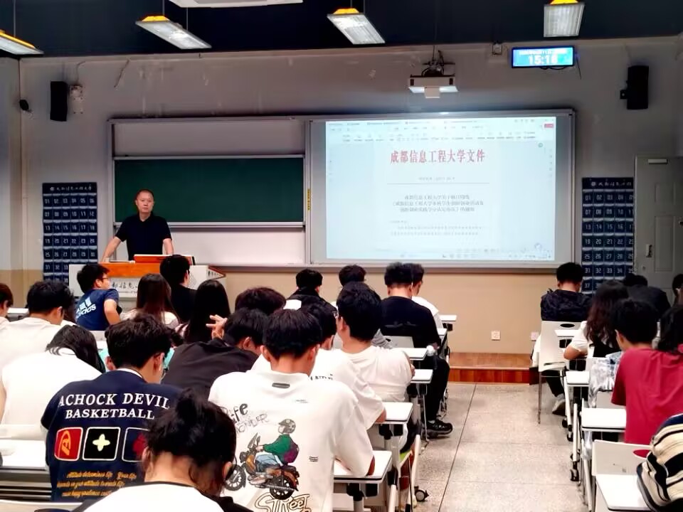 会议第二项,韩斌副教授与石磊副教授分别于H4213和H4108教室为同学们带来专题讲座。两位老师聚焦专业就业方向,系统剖析了行业现状与发展前景,并就“如何提升个人竞争力、成功通过企业面试”提供了切实可行的建议。他们强调,大学生应当注重“双商”并重的发展路径:既要扎实掌握专业知识,提升智商水平,也要不断加强情商修养,特别是培养组织协调能力、沉着应变的能力以及高度的团队意识。最后,两位老师详细解读了《成都信息工程大学本科学生创新创业活动及创新创业实践学分认定办法》,为同学们顺利获取相应学分提供了清晰指引。