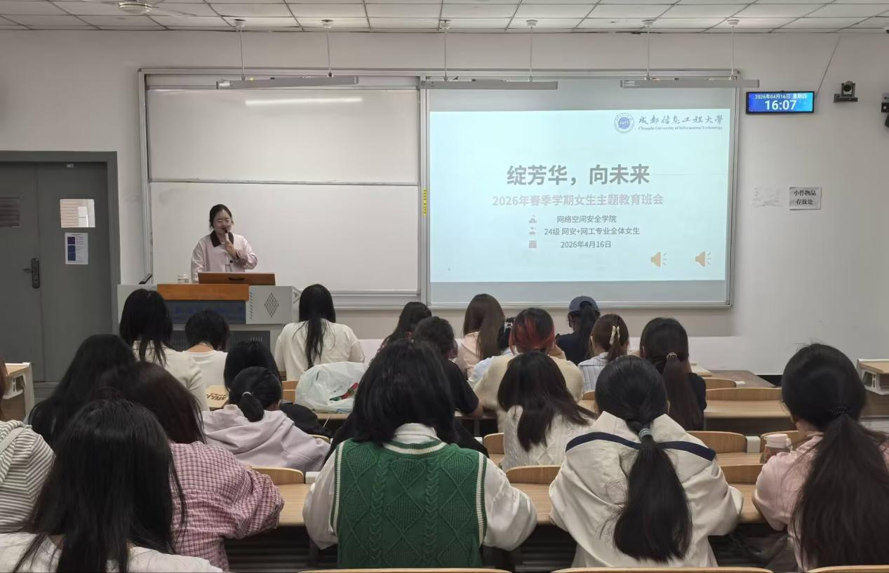 2024级网络空间安全与网络工程专业在H1107召开以“绽芳华,向未来——致每一位安静却有力量的女孩”为主题的女生专题教育班会。本次班会由辅导员韩阳主持,2024级网络空间安全、网络工程专业全体女生参加会议。