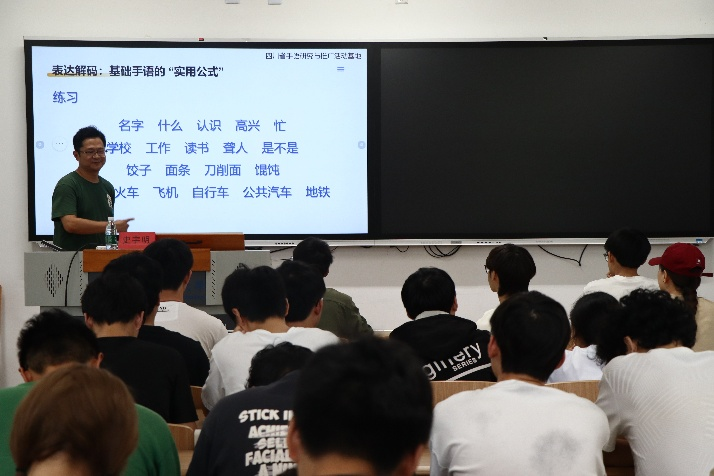 讲座中,史老师以通俗易懂的方式介绍了手语的基本规则。“手语是一门视觉语言,面部表情能够帮助我们传递更丰富的信息。”通过简单手势配合生动的现场演示,史老师让同学们直观感受到在手语表达中,“表情”与“动作”具有同等重要的作用。随后,他引导同学们运用刚学到的手语进行实践,逐步理解手语的“手形、位置、朝向、运动、面部表情”五大要素。史老师还特别讲解了手语语法与口语语法之间的差异。以“灭火”为例,他指出汉语的表达顺序为“灭—火”,而手语则采用“火—灭”的逻辑结构。这一贴近生活的案例,让同学们深刻体会到手语作为一种独立语言的表达特点。