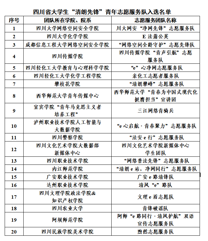 为深入学习贯彻习近平法治思想和习近平总书记关于网络强国的重要思想,深入宣传解读互联网法律法规,普及网络举报辟谣知识,提升青年学生对网络有害信息的辨识能力,中共四川省委网信办与共青团四川省委联合组织开展2025年在川高校大学生“e路同行 清风护航”青春志愿专项行动。此次行动面向全省高校选拔招募20支四川省大学生“清朗先锋”青年志愿服务队。我院“网络空间全龄守护”志愿先锋队脱颖而出,成功入选。